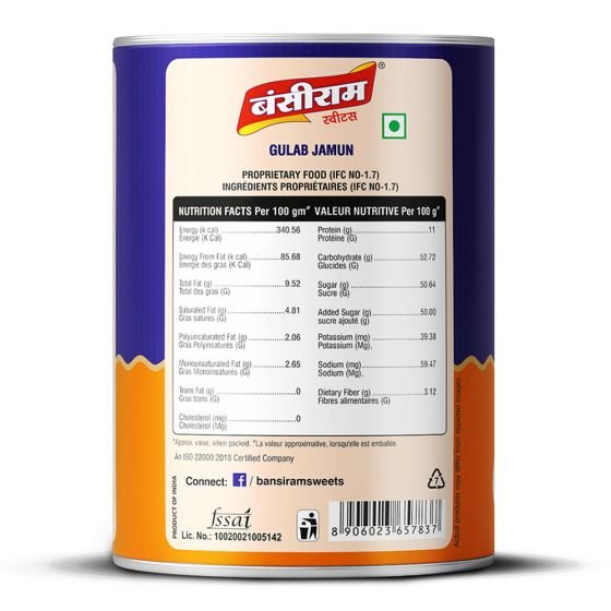 This is a pack of Bansiram Gulab Jamun with a net weight of 1 Kg. It comes with a shelf life of 12 month.